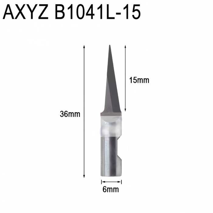 The AXYZ B1041L-15 Multicam BT-57265 Oscillating Knife Blade is a high-precision cutting tool designed for Multicam and AXYZ digital CNC cutting systems. This sharp-pointed knife features a 13.4° angle and a 6 mm round shank mount, ensuring secure installation and precise cutting performance.