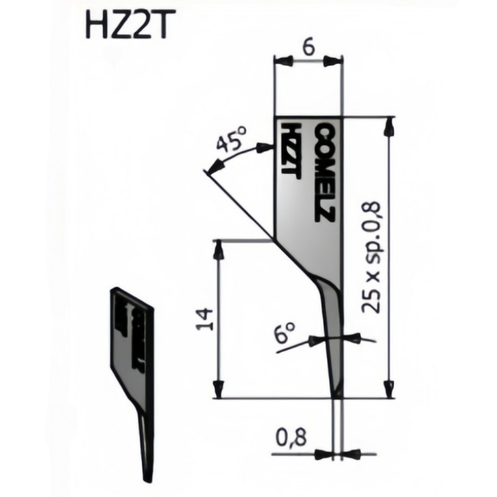 The Comelz HZ2T Oscillating Knife Blade is a high-precision pointed blade designed for Comelz CNC cutting machines. Featuring a 0.8 mm flat mounting interface and a 6° cutting angle, this blade ensures smooth penetration and precise cutting for various flexible and semi-rigid materials.
