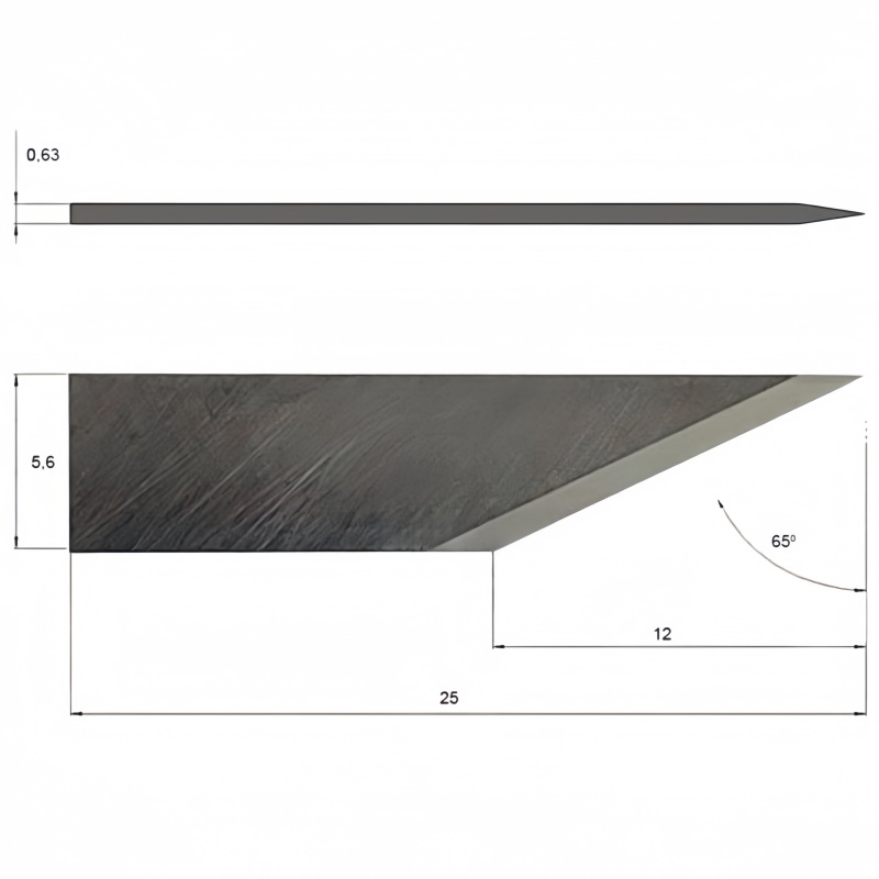 This tungsten carbide flat blade features a 0.63 mm thickness flat mounting and a 65° cutting angle, making it ideal for both drag cutting and oscillating cutting tools, especially when working with thicker materials.