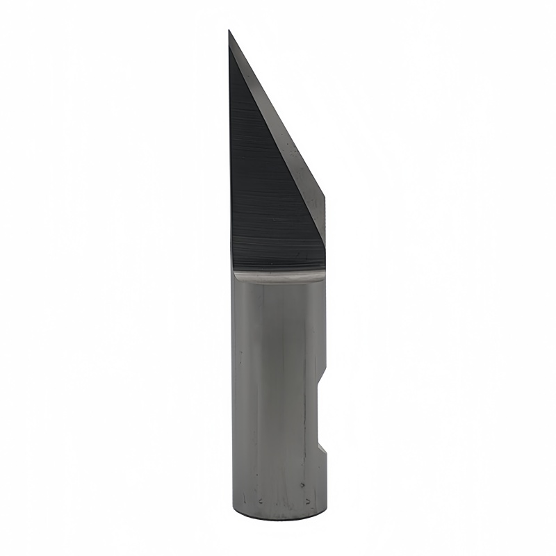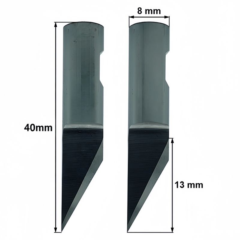 This tungsten carbide drag blade features a Ø8 mm round shank (Weldon mounting) and a 40° cutting angle, providing excellent cutting performance for packaging materials and industrial sheets.