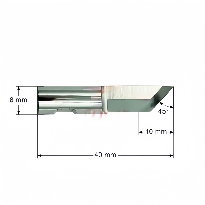 Product Description: The BLD-SR8146 (Part Number: G34143362) is a replacement cylindrical drag blade manufactured from high-grade tungsten carbide, specifically engineered for compatibility with Esko Kongsberg digital cutting systems. This blade features an 8 mm round shank (fi 8 mm) with a Weldon-style mounting for secure tool retention. Designed with a 45° cutting angle, it accommodates a maximum cutting depth of 10.00 mm. The physical dimensions consist of a 40.00 mm height and an 8 mm diameter. It is technically specified for the precision cutting of lightweight yet rigid substrates, particularly foam board and hard foam materials.