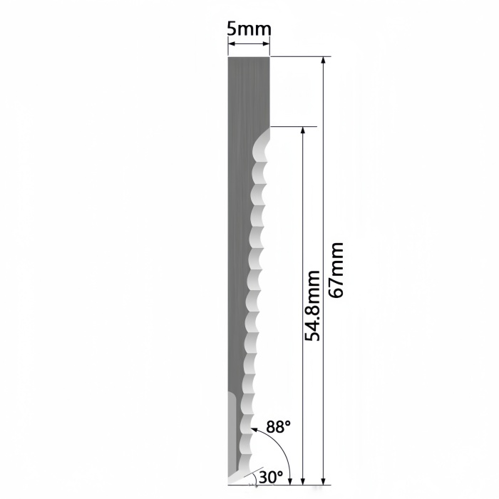 With a 67 mm blade height and a maximum cutting depth of up to 55 mm, this flat oscillating serrated knife blade provides stable and consistent cutting results. The 30° cutting angle, combined with the serrated blade edge, allows smoother material engagement and improved edge quality when processing acrylic.