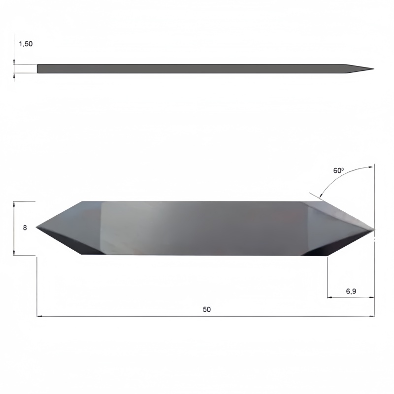 Product Description: The Z13 (Part Number: 3910305) is a replacement double-sided drag blade manufactured from high-grade tungsten carbide, specifically engineered for compatibility with Zund, Lectra MFC, and Humantec digital cutting systems. This flat drag knife features a 60° cutting angle and a symmetrical double-sided edge, extending tool life and providing high-precision performance for both through-cutting and kiss-cut applications. It utilizes a 1.5 mm flat mounting interface and accommodates a maximum cutting depth of 6.90 mm. The physical dimensions consist of a 50.00 mm height, an 8.00 mm width, and a 1.50 mm thickness. It is technically specified for processing a broad range of substrates, including gasket materials, hard plastics, footwear components, and various technical textiles and self-adhesive foils.