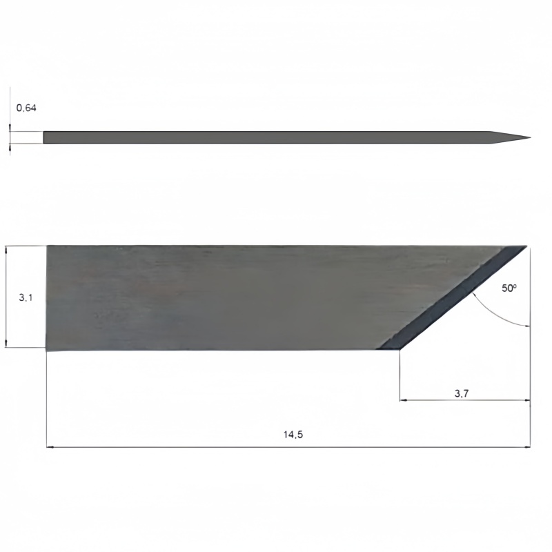 Featuring a 50° cutting angle and a maximum cutting depth of 2.00 mm, the Z30 is optimized for creating clean, decorative beveled edges in matting applications. Its compact dimensions (14.50 mm height and 3.10 mm width) combined with a 0.63 mm thickness ensure exceptional stability and accuracy within the tool holder. The robust carbide construction provides the superior sharpness and edge retention required to prevent fraying or snagging on dense, fibrous mat board materials.
