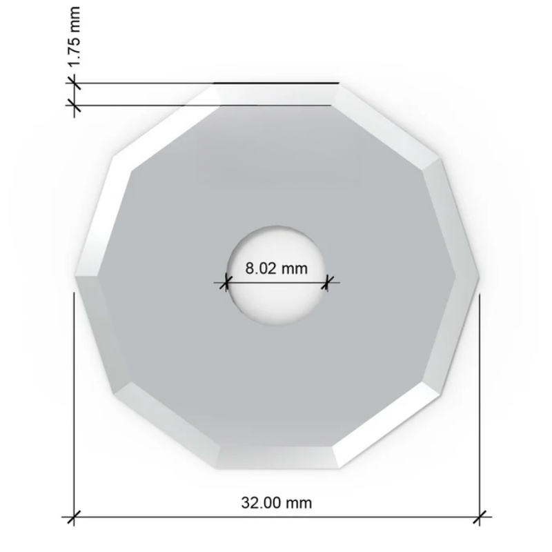 Product Description: The Z52 (Part Number: 3910337) is an industrial-grade decagonal rotary blade manufactured from premium tungsten carbide, optimized for the high-speed processing of technical textiles and reinforced fiber composites. This 32 mm diameter blade features a specialized 10-sided geometry and a 36° cutting angle, designed to provide a cleaner shearing action and significantly reduce material bunching compared to traditional circular blades.