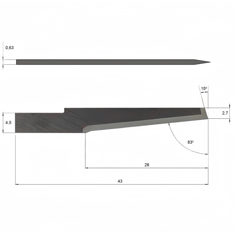 Product Description: The Z63 (Part Number: 5002637) is a specialized replacement oscillating blade manufactured from premium tungsten carbide, designed for integration with Zund S3 flatbed cutters and digital cutting systems. Similar in profile to the Z62 but extended for greater reach, this pointed flat blade features an 83° cutting angle and is engineered specifically to execute precise cuts with a small pre-cut profile.