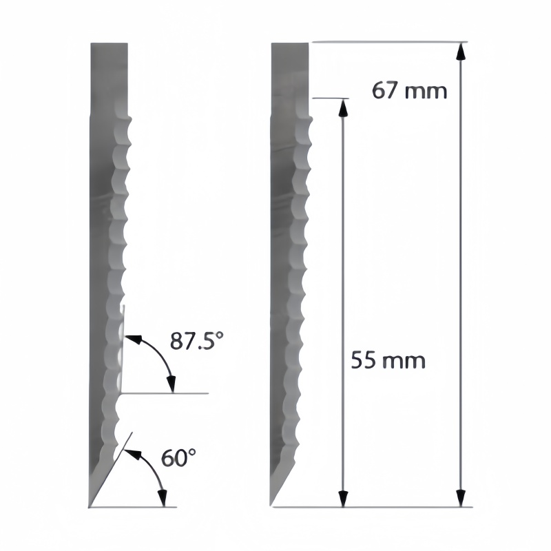 With a unique 87.5° / 60° dual-angle geometry and a serrated edge profile, the Z66 is specifically engineered to reduce friction and heat buildup when slicing through expanded substrates. It accommodates an impressive maximum cutting depth of 55.00 mm, making it the industry standard for processing honeycomb panels, polyethylene (PE) foams, polypropylene, and PU sponges. The 67.00 mm overall height provides the necessary reach for clean, perpendicular through-cuts in high-volume foam and insulation manufacturing, while the premium carbide construction maintains a razor-sharp edge through demanding production cycles.